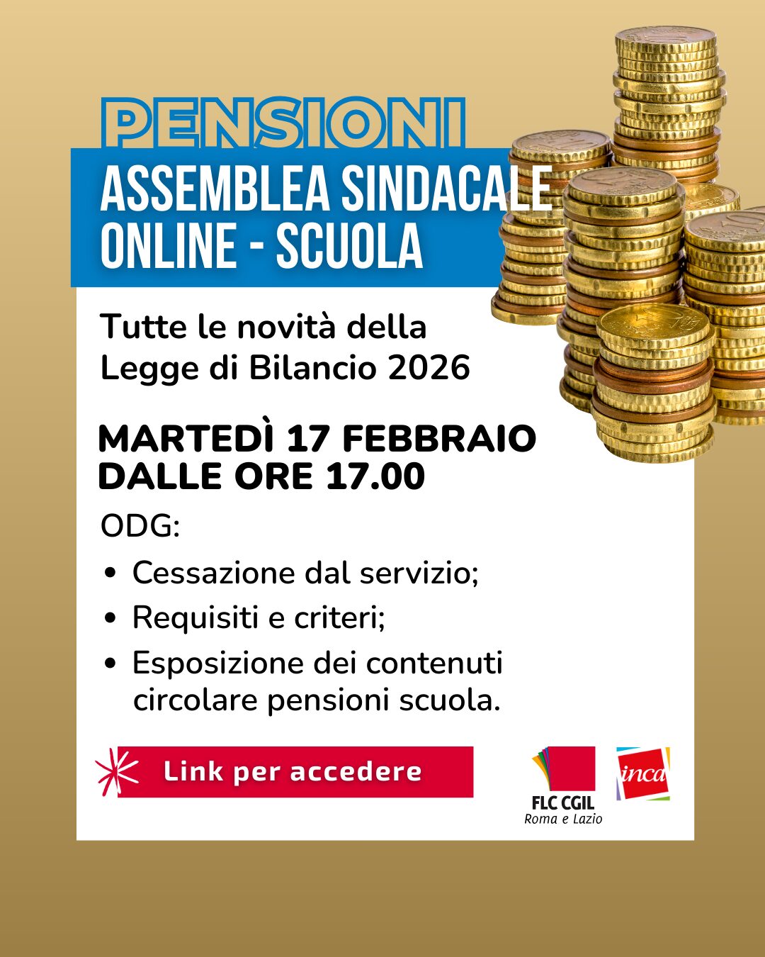 HomecircolariComunicazione n. 175 Assemblea sindacale – 17 febbraio 2026 ore 17-19 – Pensioni 2025/2026 Comunicazione n. 175 Assemblea sindacale – 17 febbraio 2026 ore 17-19 – Pensioni 2025/2026 Categorie circolari Data: 13/02/2026 timbro_Assemblea sindacale â 17 febbraio 2026 ore 17-19 â Pensioni 2025.2026-2 Dimensione file: 310.64 KB Download Anteprima timbro_Assemblea sindacale â 17 febbraio 2026 ore 17-19 â Pensioni 2025.2026-2 Dimensione file: 310.64 KB Download Anteprima Locandina_Assemblea_Pensioni_Scuola_17_Febbraio_FLC_CGIL_Roma_Lazio Dimensione file: 176.04 KB Download Anteprima Locandina_Assemblea_Pensioni_Scuola_17_Febbraio_FLC_CGIL_Roma_Lazio Dimensione file: 176.04 KB Download Anteprima Comunicazione n. 173 annullamento collegio docenti Comunicazione n.176 Convocazione Consigli di Interclasse